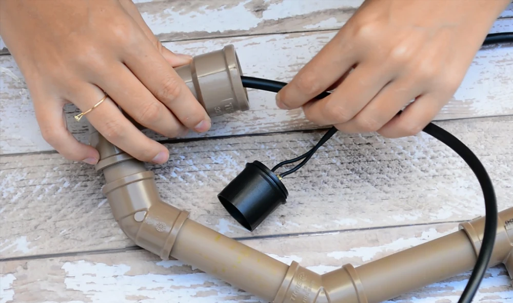 Passo 7: Utilize o último cano de 2cm para juntar a base com a parte superior da luminária, e ela está quase pronta.