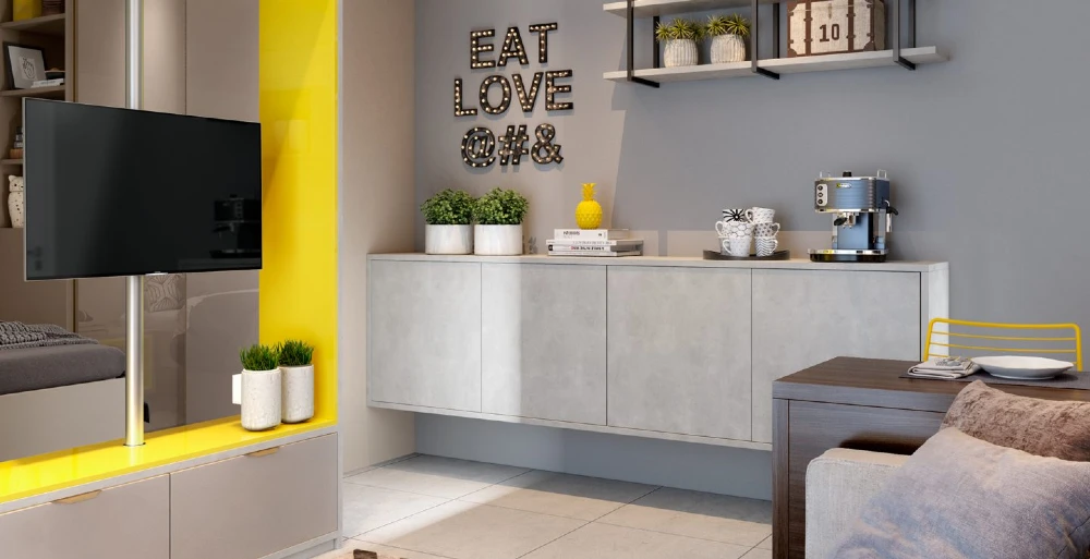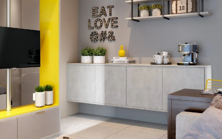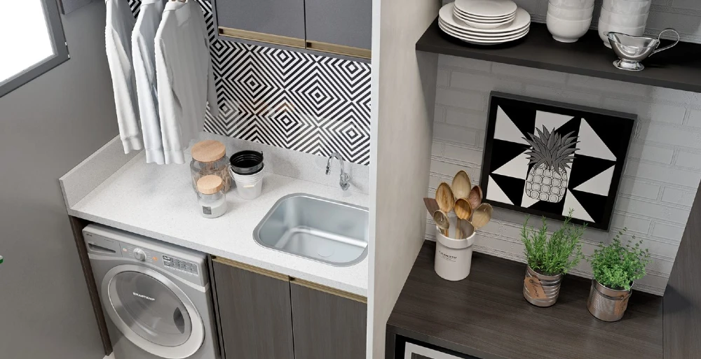 A mobília têm grande influência deste estilo. Pode seguir o padrão industrial, com tons mais fechados e estruturas metálicas à mostra, como as nossas prateleiras da  linha Nero, semelhantes a serralheria. Tons neutros e texturas também marcam presença – um exemplo, são as frentes desse armário aéreo que possui frentes do padrão Eros, com textura semelhante a mármore.