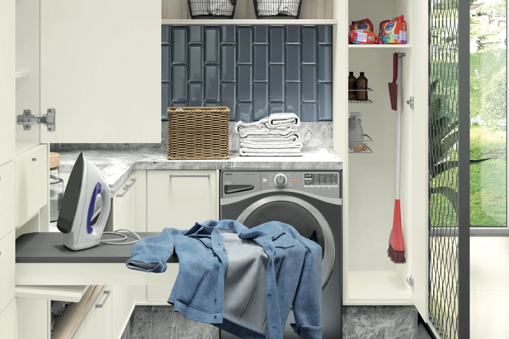diferentes cômodos da casa, como banheiro, sala, lavanderia e quarto. Além disso, o azul