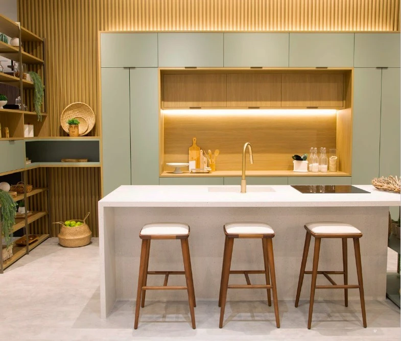 Inspirado nas cristalinas águas caribenhas, este revestimento de tom verde suave e leve, permite um toque de cor de forma atemporal.