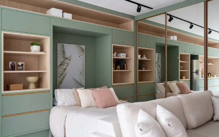 Com um quarto de casal planejado, é possível otimizar o espaço ao máximo, optando por soluções de armazenamento criativo, como gavetas na base da cama, prateleiras e nichos flutuantes, bancadas suspensas, entre outras ideias.