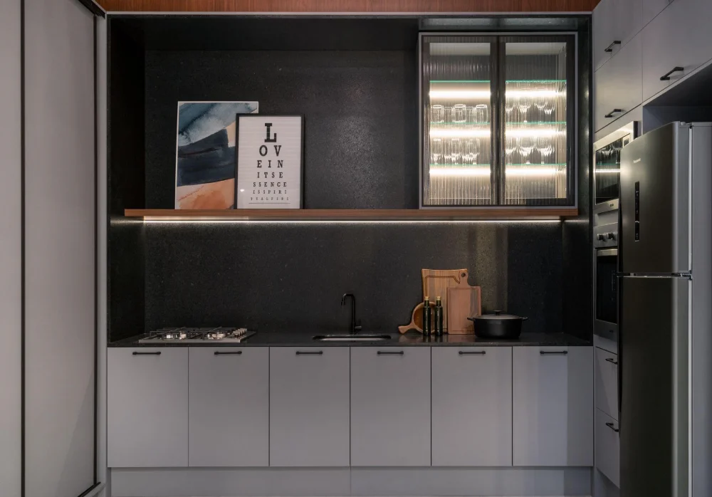 Além de oferecerem um visual moderno, elas permitem expor utensílios e objetos decorativos, dando um toque de personalidade ao ambiente. Essas prateleiras também ajudam a criar a sensação de amplitude na cozinha.