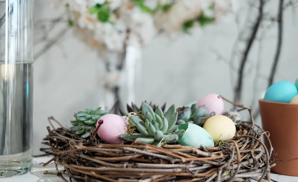 E que tal uma decoração com suculentas? As suculentas são plantas adoráveis e de fácil manutenção. Coloque-as em pequenos vasos em forma de ovos de Páscoa ou em coelhos de cerâmica. Aproveite a delicadeza dessa decoração e espalhe pela casa, usando pequenos espaços nas mesas de apoio, estantes, prateleiras e nichos, e dê um toque especial à sua decoração.