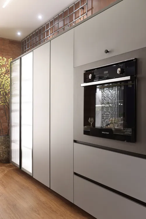 · Cozinha: na lateral do studio, encontra-se uma cozinha compacta, integrada ao ambiente principal. Os armários superiores vão até o teto, aproveitando ao máximo a altura do espaço. As portas dos armários são de correr, economizando espaço de abertura. A bancada da cozinha é extensível, podendo ser recolhida quando não estiver em uso, criando mais espaço para circulação.