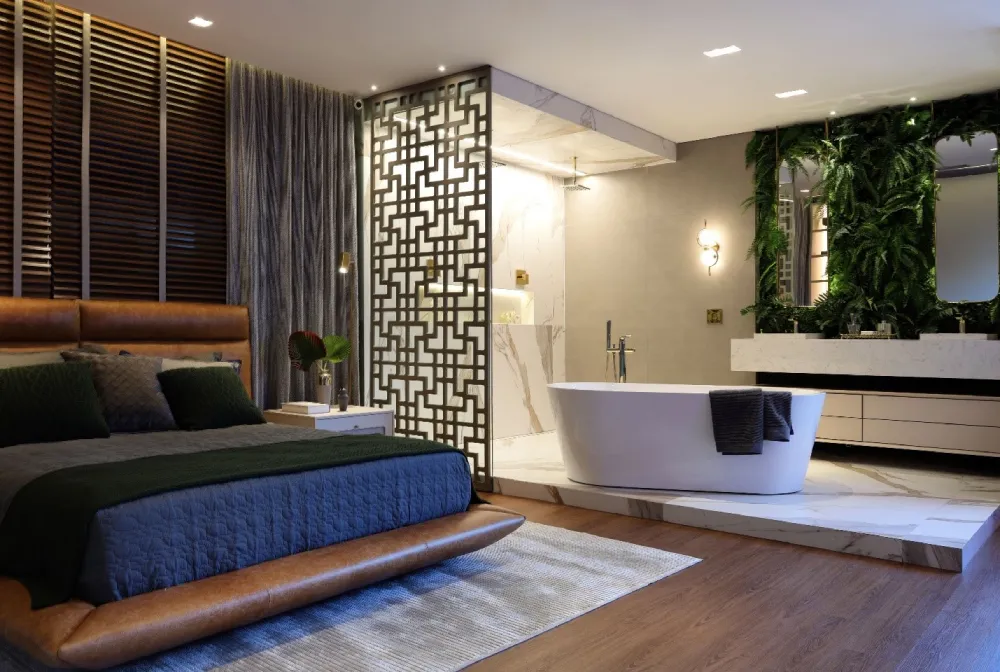 Outro ponto forte das suítes planejadas são os móveis multifuncionais. Em um ambiente compacto, cada peça de mobília deve ser escolhida com cuidado para desempenhar mais de uma função. Por exemplo, uma cama que se transforma em sofá durante o dia, mesas retráteis que podem servir como mesa de jantar ou espaço de trabalho, e prateleiras que também funcionam como divisórias de ambiente.