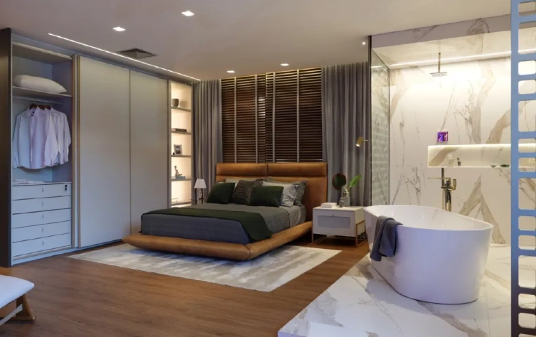 Um guarda-roupa ou armário planejado é crucial para manter o ambiente organizado. Em um dormitório de casal, os armários planejados podem incluir divisórias específicas para cada pessoa, facilitando a organização. Opções como portas de correr, espelhos e iluminação interna podem ser incorporadas para otimizar ainda mais o espaço. Para dormitório de solteiro, optar por um armário embutido pode liberar mais área útil para outras atividades.