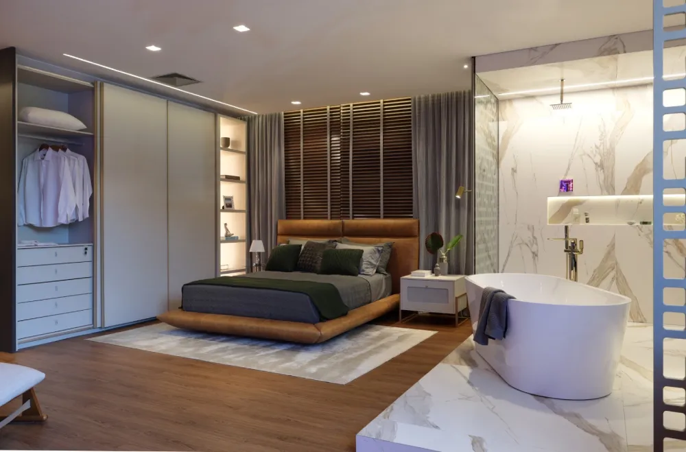 Móveis planejados e cores: para integrar bem os móveis planejados no quarto, opte por cores que complementem a paleta principal. Guarda-roupas e cabeceiras em branco ou cinza claro podem dar um toque elegante, sem perder a harmonia.