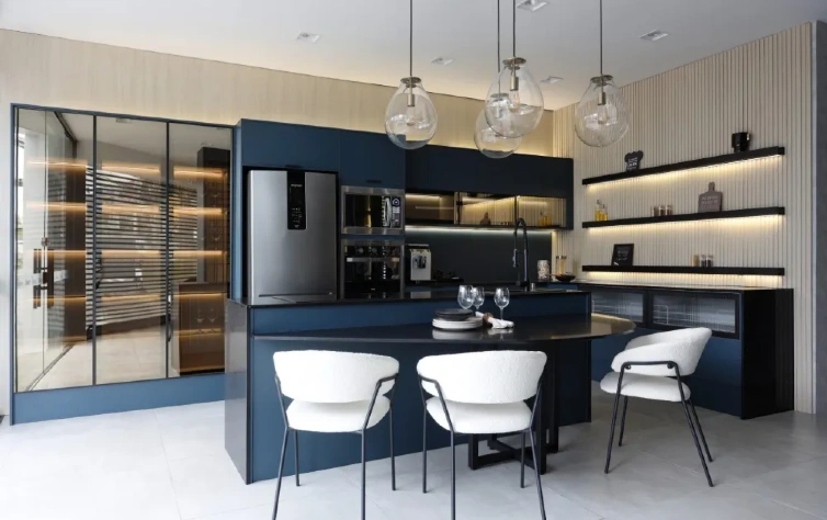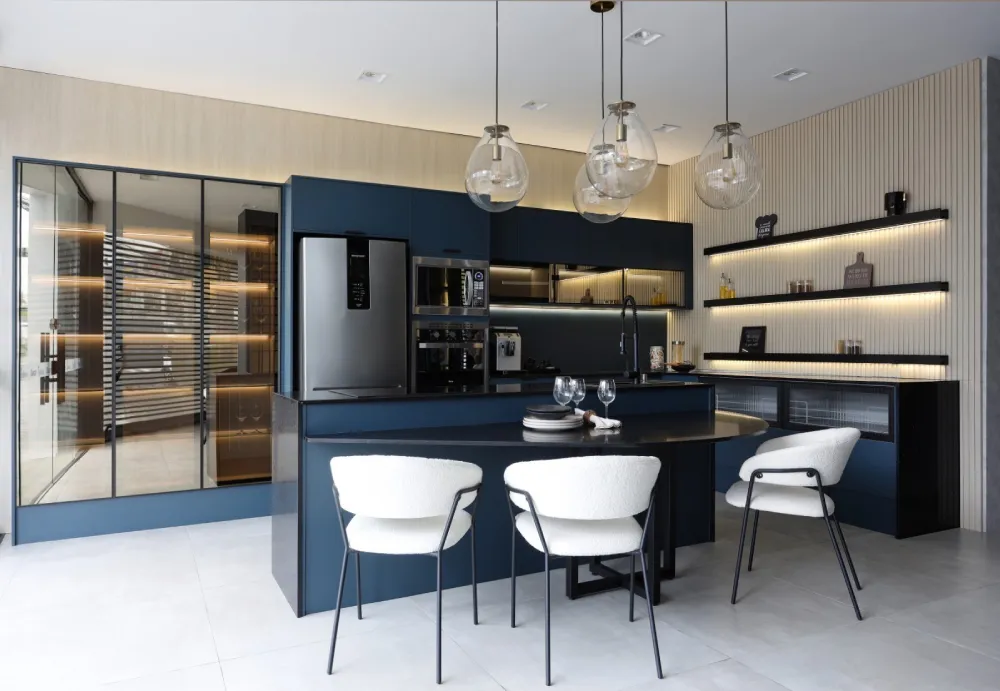 Tendências de cores: cores como azul petróleo, cinza e branco estão em alta para criar uma cozinha moderna e atemporal. Para uma sensação mais acolhedora, tons de verde e marrom claro também são opções populares.