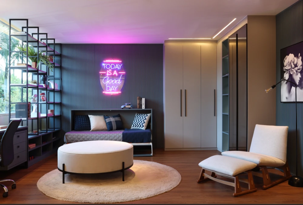 As cores neutras como cinza, bege e tons pastel continuam em alta, assim como acabamentos foscos e texturizados que trazem uma sensação de modernidade e sofisticação ao dormitório.