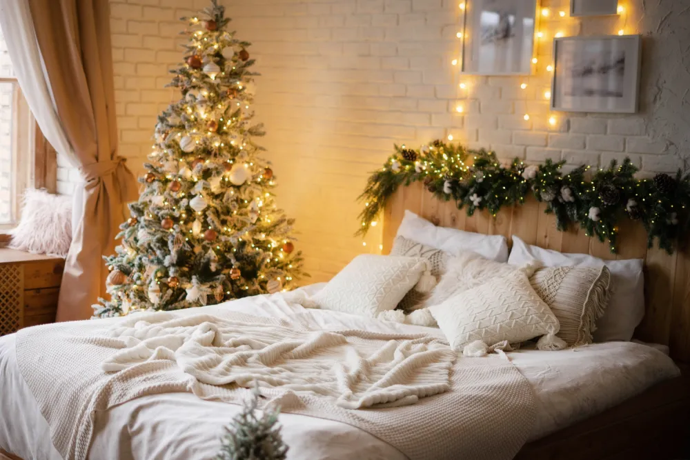 A iluminação é crucial para criar uma atmosfera acolhedora. Em espaços pequenos, use luzes de Natal de forma estratégica.
