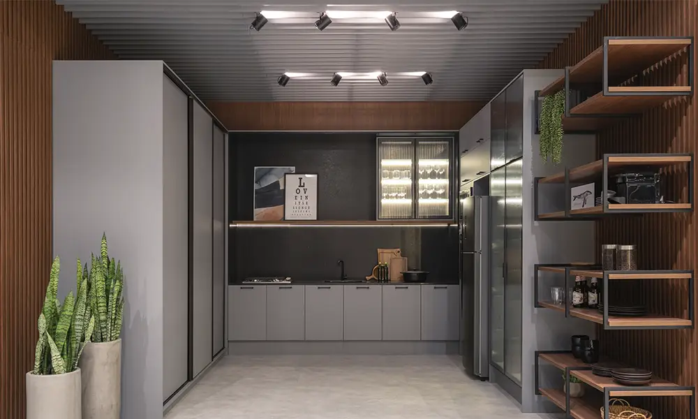 - Iluminação funcional: essencial nas áreas de preparo, como bancadas, pia e fogão, facilitando o manuseio de alimentos e utensílios.
