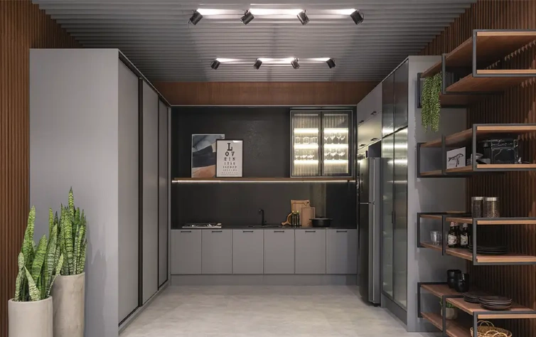 - Painéis em MDF e MDP com acabamento BP: muito utilizados por sua durabilidade e praticidade, esses revestimentos oferecem diferentes cores, padrões e texturas, permitindo criar desde cozinhas mais neutras até projetos com mais personalidade.