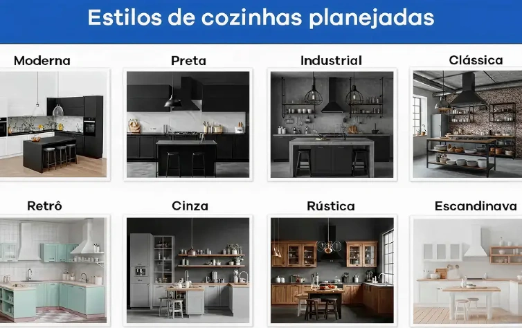Abaixo, você confere os principais estilos de cozinha planejada, com características, cores e materiais que ajudam a identificar qual deles faz mais sentido para você.