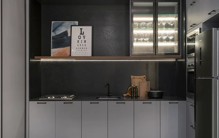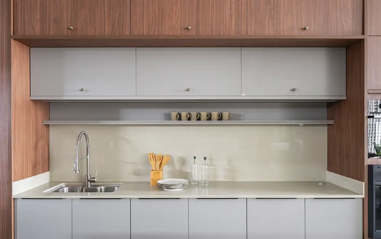 Além desses, o vidro aparece com frequência em portas de armários superiores, trazendo leveza visual e ajudando a ampliar a sensação de espaço. Já a laca, com acabamento uniforme e sofisticado, é uma escolha comum em projetos que buscam um visual mais contemporâneo, embora exija um pouco mais de cuidado no uso diário.