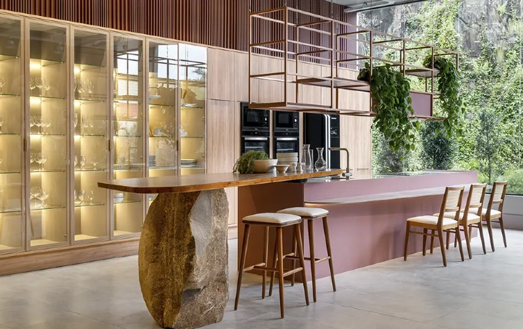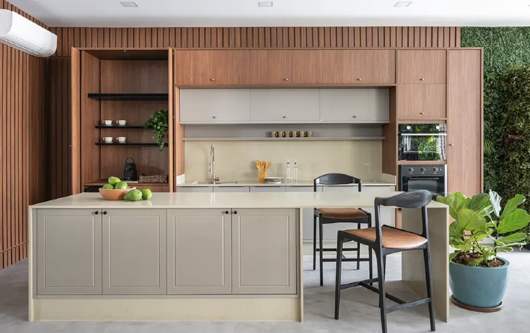 Texturas que remetem à natureza continuam em evidência. Acabamentos amadeirados, superfícies com toque natural e materiais fáceis de limpar aparecem como escolhas frequentes, equilibrando estética e praticidade. A tendência é optar por soluções duráveis, pensadas para o uso diário, com menos excessos visuais.