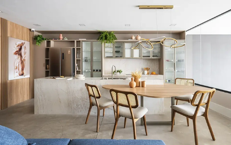 As cozinhas seguem cada vez mais abertas e integradas a outros ambientes da casa. Bancadas multifuncionais, ilhas e projetos que favorecem a circulação reforçam a ideia de um espaço pensado para reunir, cozinhar, conversar e viver diferentes momentos do dia.